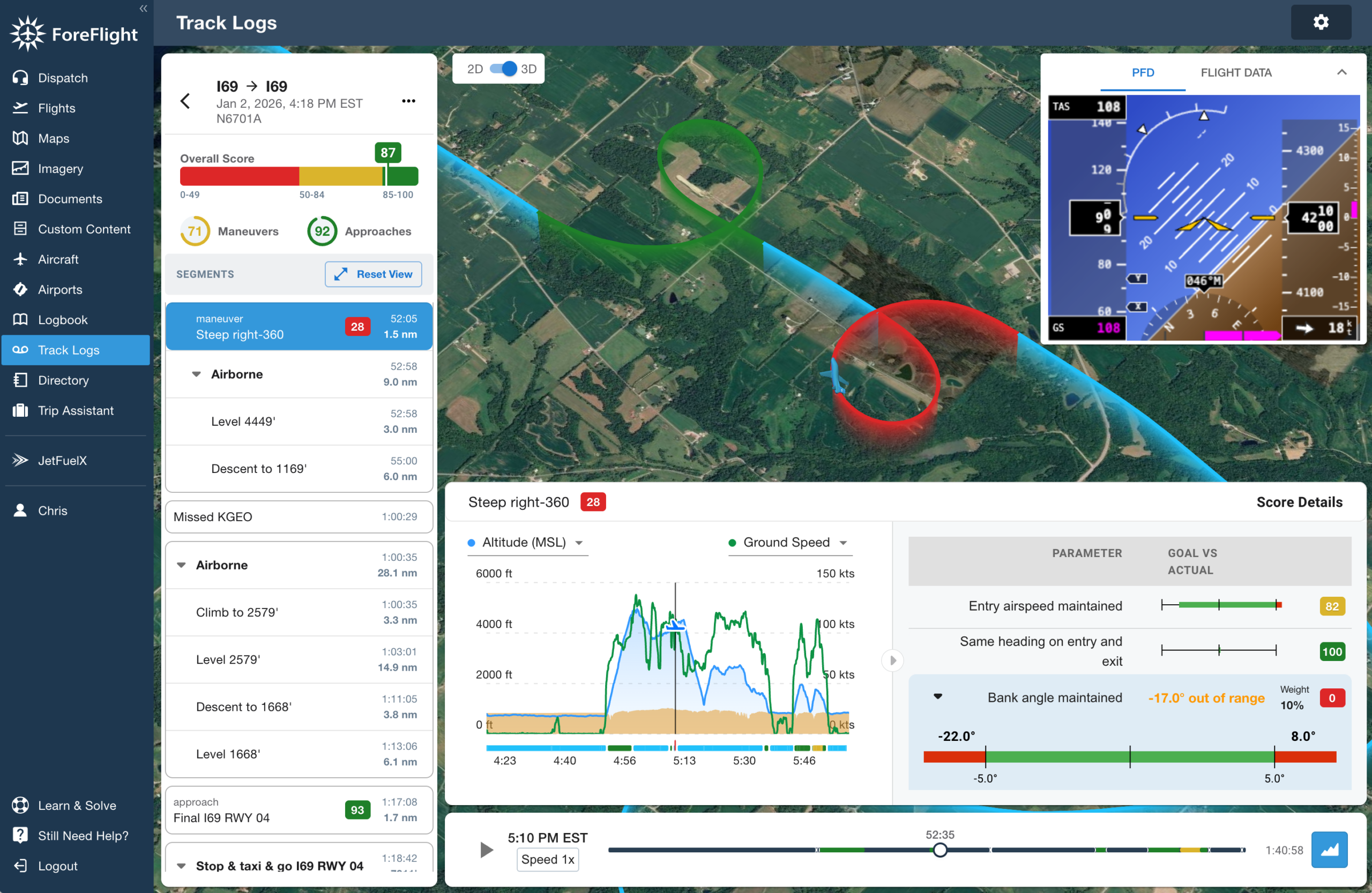 ForeFlight is the app of choice for most student pilots, thanks to its intuitive interface and high adoption rate among flight schools. During each flight, ForeFlight will track and log all flight parameters, including ground track, pitch, bank, groundspeed and altitude (requires Sentry or Sentry Plus).