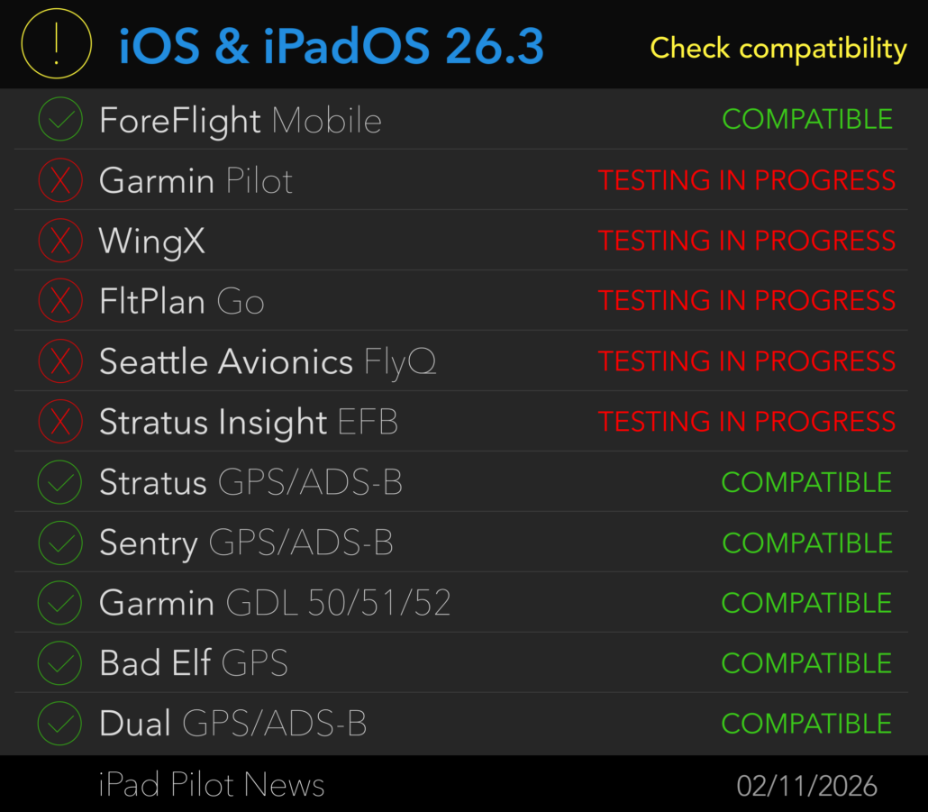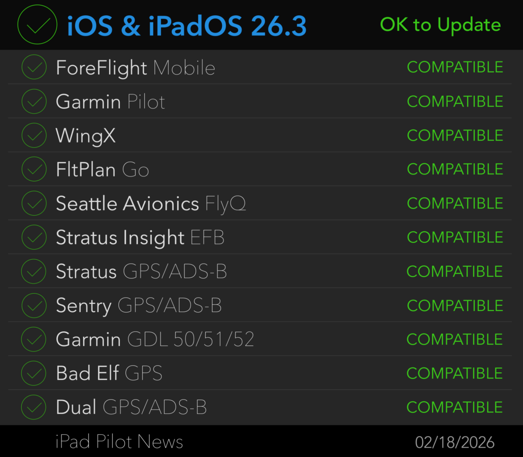 Just received the all clear for Garmin Pilot, via the EFB, for iPadOS 26.