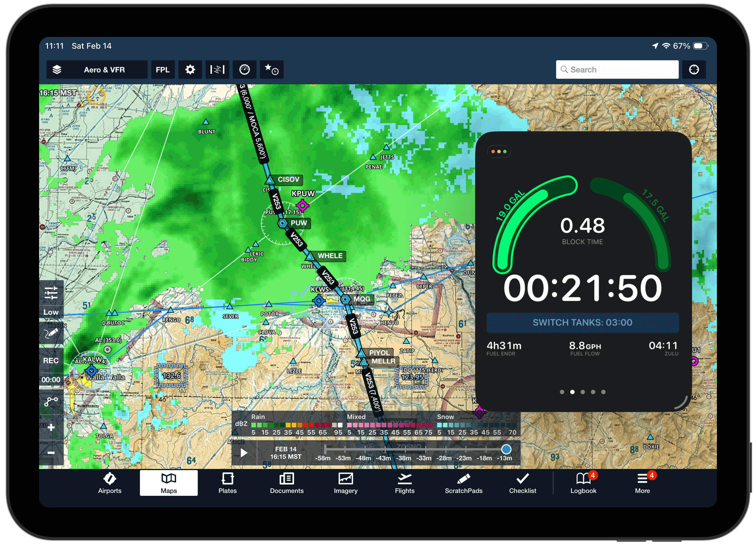 SkyTimer is one of our favorite apps for managing one of the two of the most important aspects of any flight: monitoring flight time and tracking fuel. The app will track total time, time out, time off, and time on each fuel tank. Using the fuel burn you entered when creating an aircraft profile, SkyTimer offers updated endurance estimates, fuel load in each tank, and total fuel burn. It’s simple, but it’s well designed—easy to read in flight and visually clean.