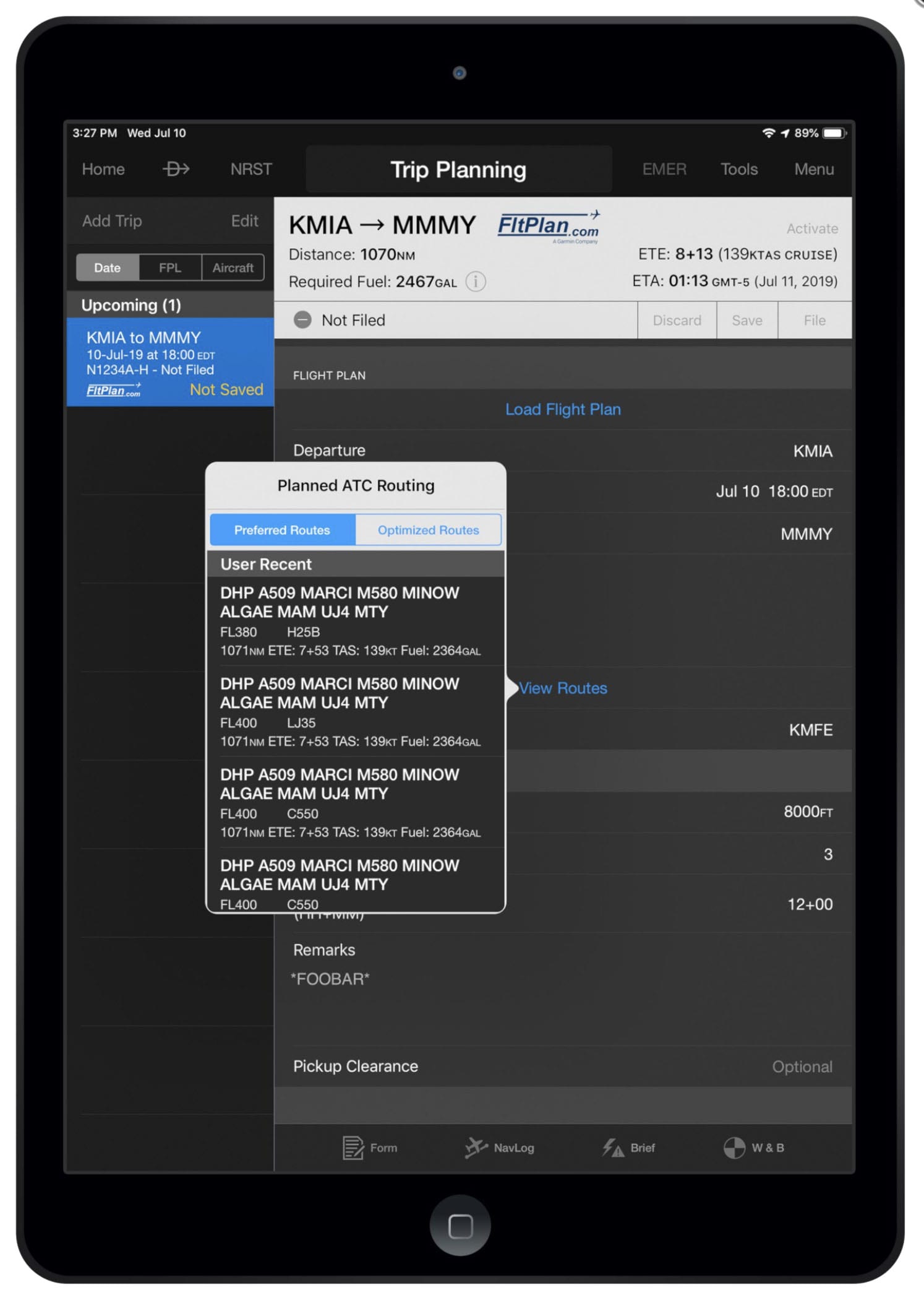 When entering flight data in the Trip Planning section of the app, press the View Routes button to see the options, and tap one to add it to your flight plan.