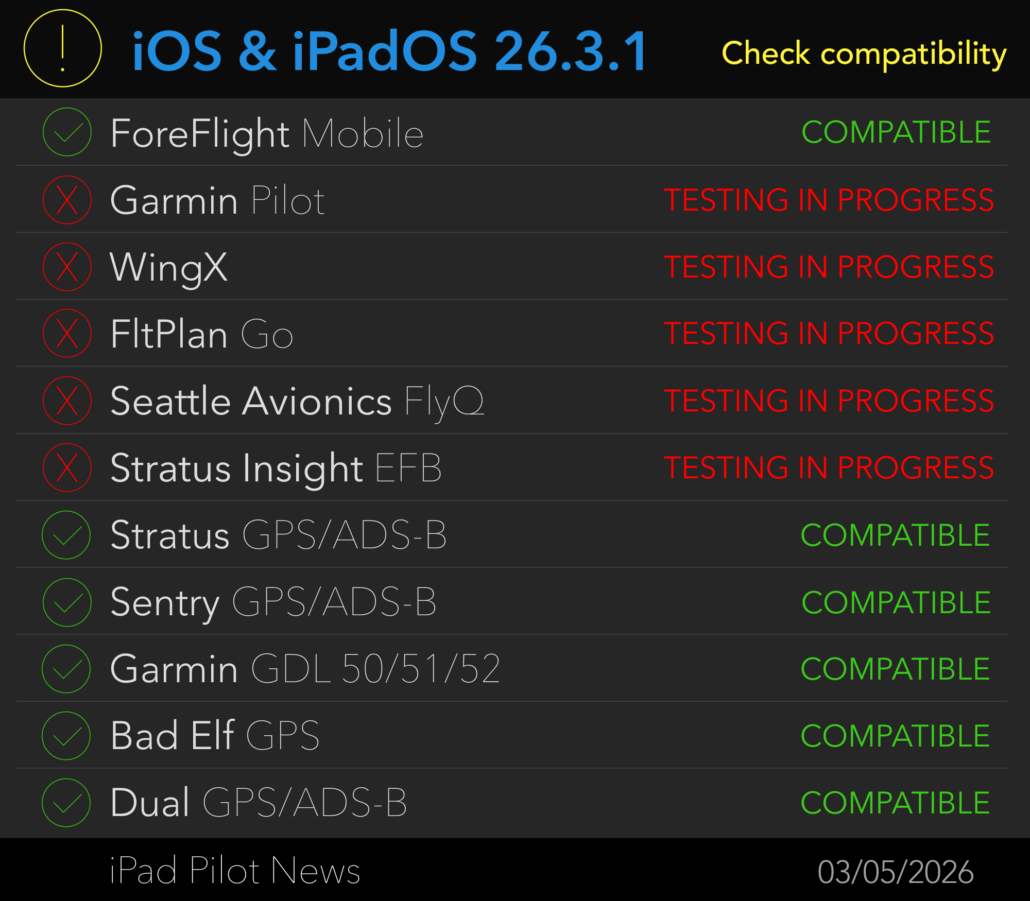 Just received the all clear for Garmin Pilot, via the EFB, for iPadOS 26.